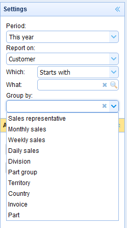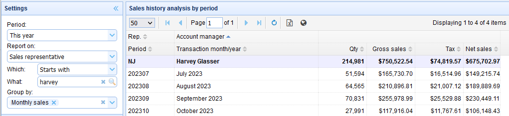 The results will be grouped according to the categorty chosen in the “Report on” setting, and they may be grouped by one or more additional categories in the “group by” selection, e.g. sales person) or by entering a specific search string.