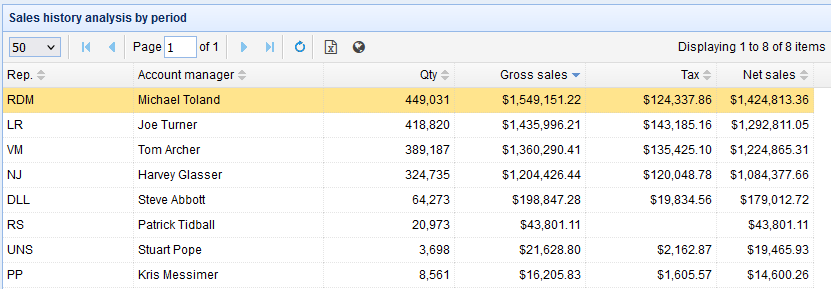 Important data can be quickly revealed by clicking on one of the buttons at the top of the columns. Most significantly, clicking on the “Net sales” column will sort the results by “Net sales” in descending order, thereby quickly identifying the customer who contributed the greatest net sales during the chosen period.