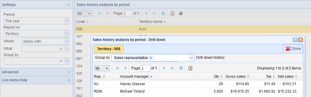 The settings allow you to analyse the sales history over a particular period. In the live demo, this may be either the last 12 months, the current financial year, or a specific month range.